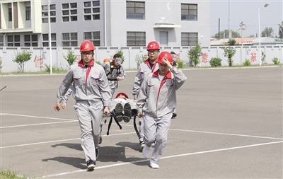 險情發(fā)生后,演習(xí)指揮部立即下令,指揮車輛駕駛員、押運(yùn)員立即啟動緊急切斷閥停止燃?xì)廨斔秃筇由?。同時,搶險分隊(duì)立即入場對車輛進(jìn)行遠(yuǎn)程消防噴淋,廠區(qū)儲罐自動啟動消防噴淋系統(tǒng),現(xiàn)場燃?xì)鉂舛扔行Ы档?,險情得到初步控制。隨后兩名搶險隊(duì)員戴呼吸器對車輛進(jìn)行檢查維修,確認(rèn)已“泄漏”已封堵。之后救護(hù)分隊(duì)入場對傷員進(jìn)行救治,10分鐘內(nèi)險情被排除。