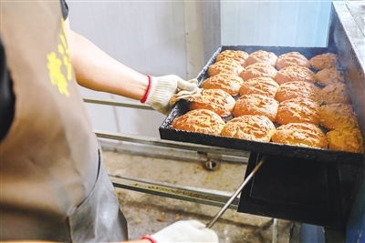 “我們堅持手工制作,就是想留住這個味道!”常三文是隆盛莊月餅制作技藝非遺傳承人,他帶記者來到了打月餅的作坊。一個約60平方米的房間里有兩個大鐵鍋,一個鐵鍋里熬著糖水,另一個鐵鍋用來和面。一名男工將面粉、熟胡麻油、糖水等按比例倒入鐵鍋,然后用鐵鏟攪拌起來。鐵鍋旁邊是一個做月餅的大案板,4個女工稱重、分劑、做胚、擺放,各自忙活著。常三文的兒子常曉峰負責將擺放好的月餅放進燒爐火的烤爐,計時、下簽子、刷油……直至月餅烤制完成出爐。