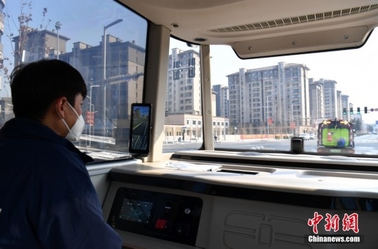 2月22日,智能網(wǎng)聯(lián)巴士901線測(cè)試車輛準(zhǔn)備發(fā)車。雄安新區(qū)的智能網(wǎng)聯(lián)巴士近期正在進(jìn)行投入運(yùn)營(yíng)前的道路測(cè)試,該巴士配備了超高感度攝像頭、超聲波雷達(dá)、激光雷達(dá)、毫米波雷達(dá)等感知設(shè)備,組成了車輛的“眼睛”。車輛可自主識(shí)別紅綠燈、道路提示牌和車道標(biāo)線等,做出跟車、超車、停車等動(dòng)作。中新社記者 韓冰 攝