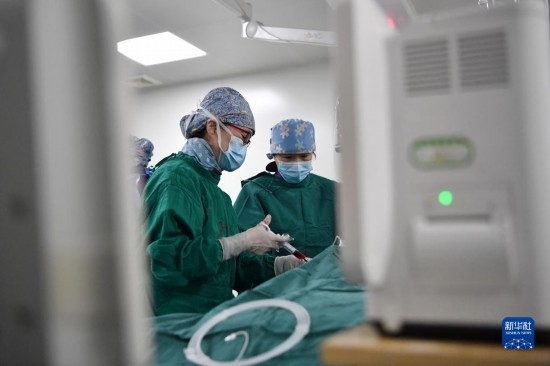 3月7日,馬娜(右)和同事在手術(shù)室為患者進(jìn)行介入手術(shù)治療。