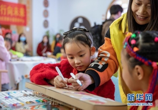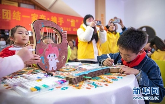 在成都市金牛區(qū)西北街社區(qū)的服務(wù)大廳一角,一群孩子正為紙板制作的各族樂(lè)器繪畫(huà)著色。