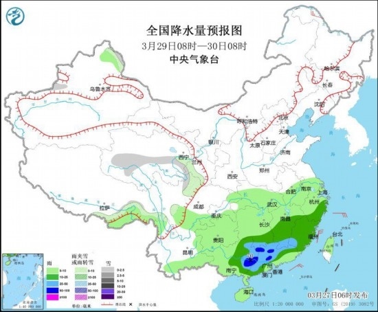 3月28日08時至29日08時,西藏北部和東部、青海東部、川西高原中北部等地部分地區(qū)有小雪或雨夾雪,其中,西藏東北部、川西高原北部等地部分地區(qū)有中到大雪。西藏東南部、江南大部、西南地區(qū)大部、華南等地部分地區(qū)有小到中雨,局地有大雨(見圖2)。