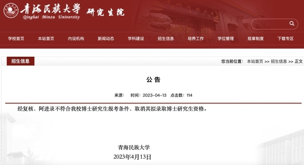 ·青海民族大學回應(yīng)黨委副書記擬錄取為本校博士:取消資格。