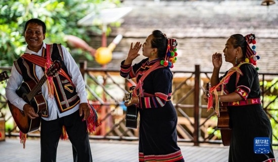 在云南省普洱市瀾滄拉祜族自治縣老達(dá)保村,致富帶頭人、拉祜族村民李娜倮(中)帶領(lǐng)村民演出(2022年7月5日攝)。