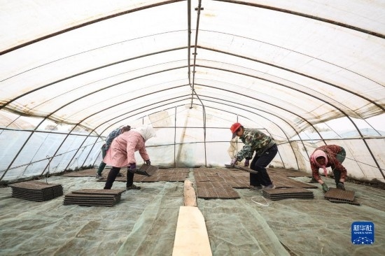 4月14日,盤錦市盤山縣的農(nóng)戶在進行水稻秧苗育苗工作。