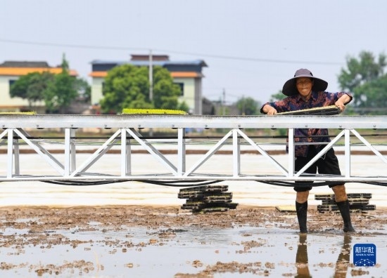 4月20日,在彭山區(qū)公義鎮(zhèn)的數(shù)智水稻示范基地,工人在秧盤(pán)智能傳輸帶上轉(zhuǎn)運(yùn)育秧盤(pán)。