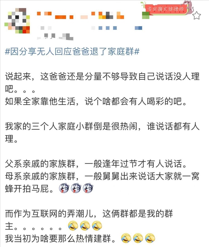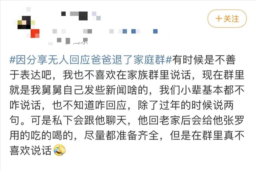 日前,一則“因分享無人回應爸爸退了家庭群”的話題引發(fā)公眾關注,登上熱搜。