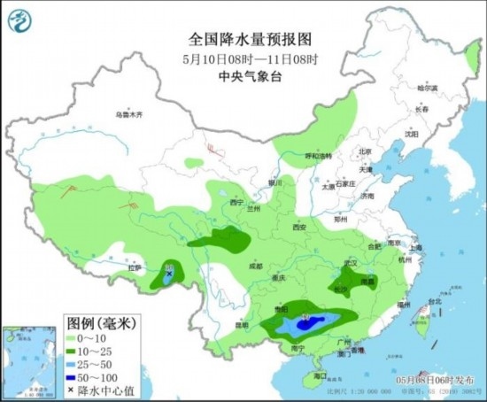 全國(guó)降水量預(yù)報(bào)圖(5月10日08時(shí)-11日08時(shí))