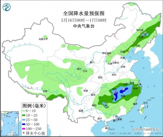 5月16日08時(shí)至17日08時(shí),黑龍江東南部、吉林中東部、遼寧北部和西部、江漢東南部、江淮西南部、江南大部等地的部分地區(qū)有中到大雨,其中,湖北東南部、安徽南部、湖南東北部、江西北部等地局地有暴雨或大暴雨(100~110毫米)。西藏南部、內(nèi)蒙古中東部、吉林中部、遼寧西部、山西北部、河北東北部等地的部分地區(qū)有4~6級(jí)風(fēng)。