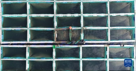 5月19日,廣鹿島鎮(zhèn)的漁民在轉(zhuǎn)運海參苗(無人機照片)。