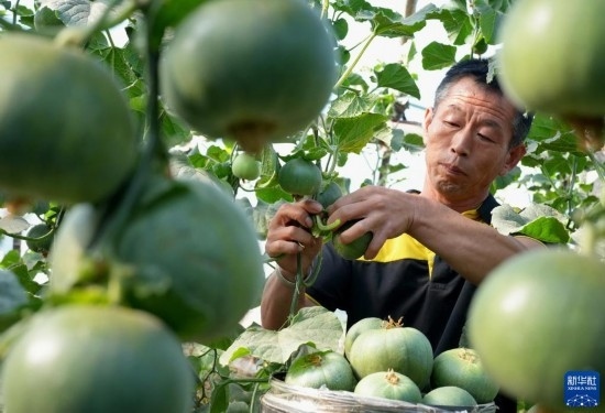 5月21日,河北省灤州市小馬莊鎮(zhèn)農(nóng)民在大棚內(nèi)采摘甜瓜。