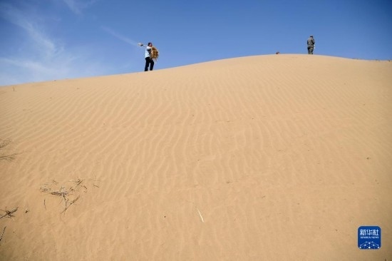 工作人員在白芨灘國家級自然保護(hù)區(qū)補(bǔ)扎草方格(6月7日攝)。