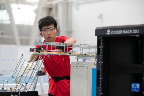 6月6日,選手在進行信息網(wǎng)絡布線項目比賽。