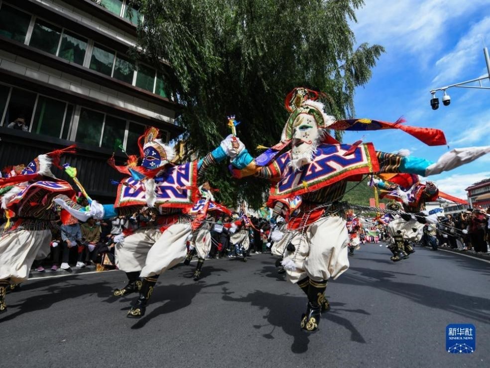 來自四川省阿壩藏族羌族自治州13個縣市的近千名演員在馬爾康市街頭開展巡游活動,展示阿壩州各個地區(qū)的非遺文化。