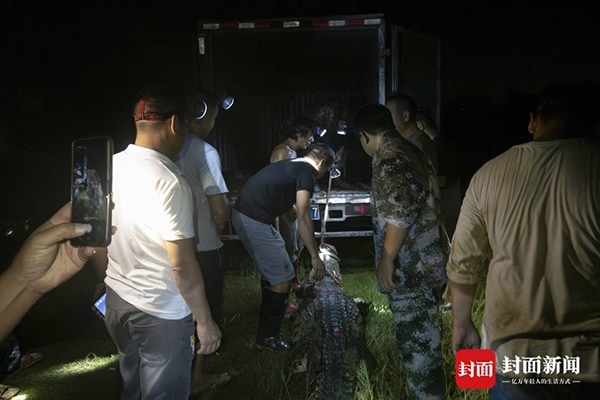 9月16日深夜,封面新聞記者從廣東茂名茂南區(qū)“出逃”暹羅鱷抓捕現(xiàn)場獲悉,當(dāng)夜有3條暹羅鱷被專業(yè)人員從養(yǎng)殖場外的水域中抓捕上岸。9月11日,茂南區(qū)一鱷魚養(yǎng)殖場因洪水沖塌圍墻造成部分鱷魚“出逃”,經(jīng)過連續(xù)6天的搜尋,截至16日24時,養(yǎng)殖場中原養(yǎng)殖的71條暹羅鱷已有69條被抓獲,僅剩2條仍在搜尋。