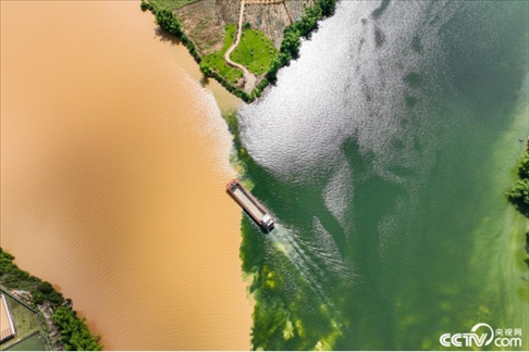 2023年7月4日,南寧三江口左右江交匯處黃綠分明,場面壯觀。每年進(jìn)入汛期后,該交匯處常常出現(xiàn)“鴛鴦鍋”景觀。