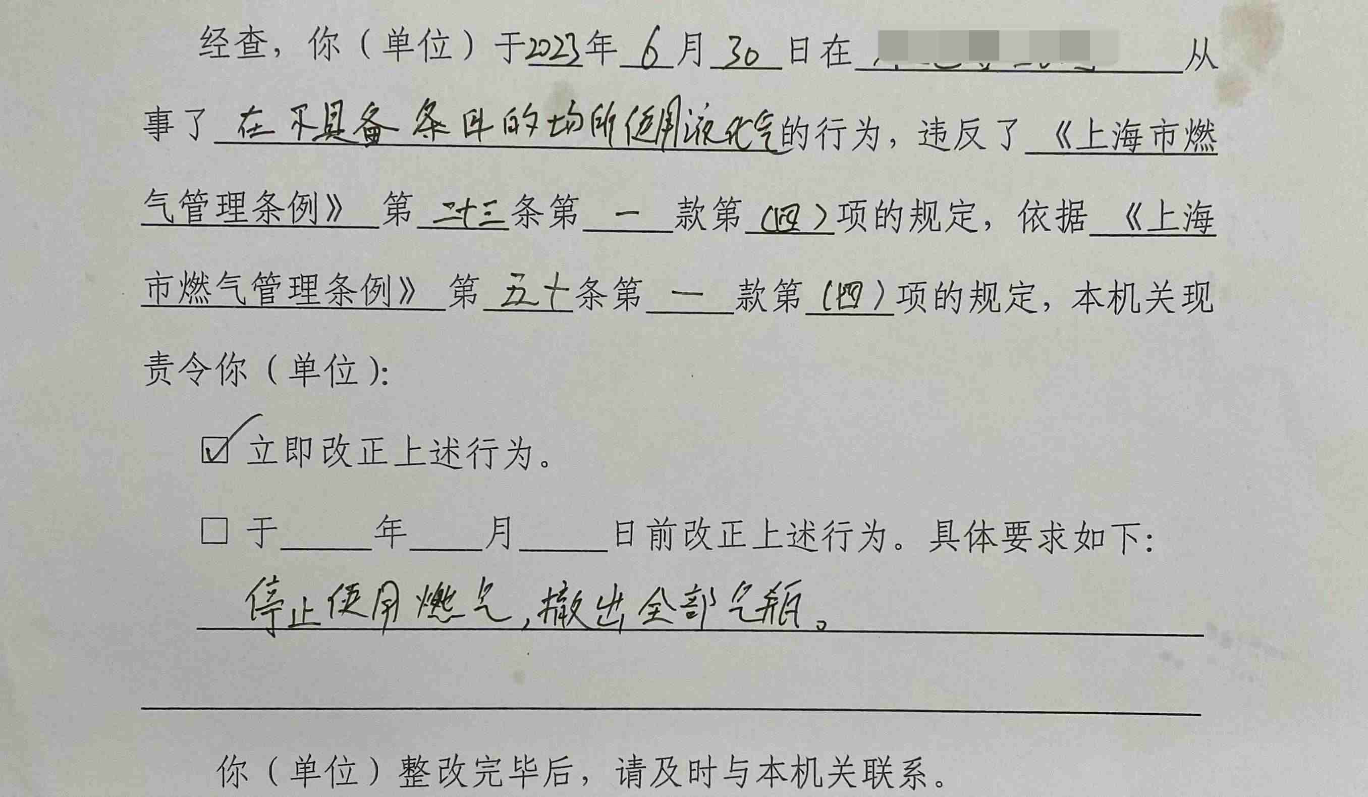 這并不是一次平常的燃?xì)庥猛旰蟾鼡Q空瓶。大概一個(gè)小時(shí)前,市住建委相關(guān)部門的檢查人員走進(jìn)餐館,檢查后責(zé)令整改,并在整改完成前暫停燃?xì)夤?yīng)。