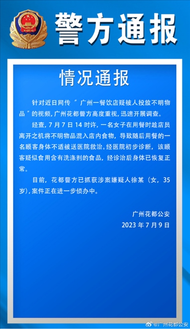 ·廣州一餐飲店內(nèi)食物被人投放不明物?警方通報:嫌疑人已被抓獲。