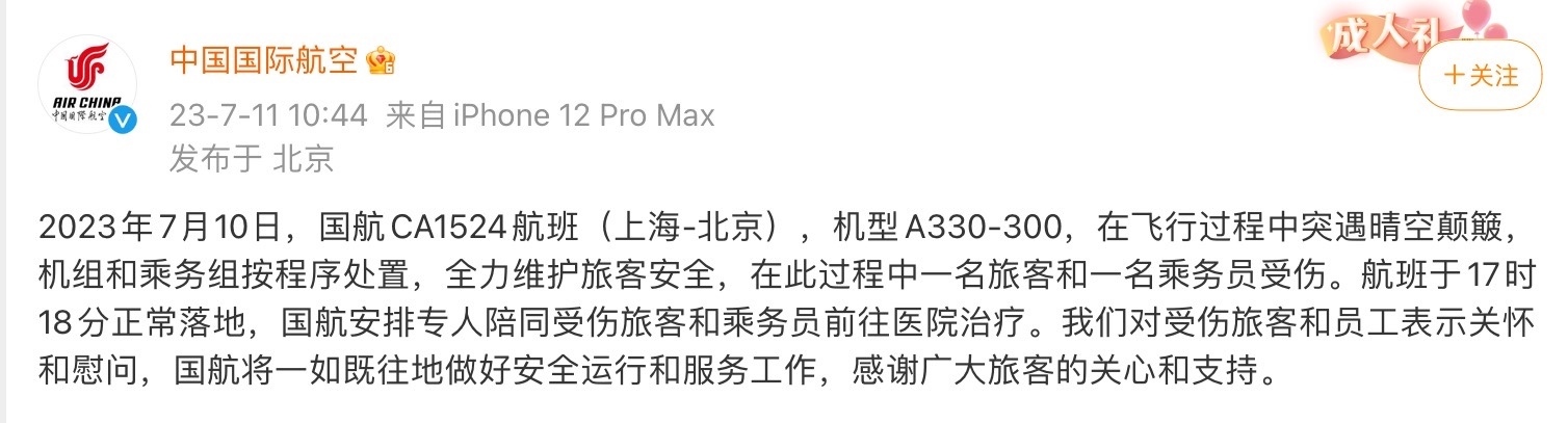 7月11日,中國國際航空在其官方微博發(fā)布通報:2023年7月10日,國航CA1524航班(上海-北京),機型A330-300,在飛行過程中突遇晴空顛簸,機組和乘務組按程序處置,全力維護旅客安全,在此過程中一名旅客和一名乘務員受傷。航班于17時18分正常落地,國航安排專人陪同受傷旅客和乘務員前往醫(yī)院治療。