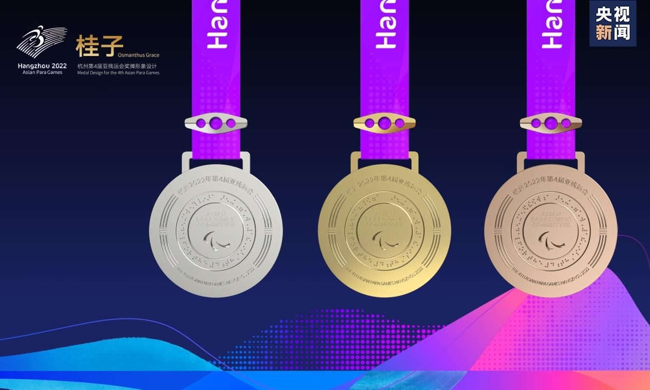 獎牌取名為“桂子”,源自描寫杭州的名句“山寺月中尋桂子”,寓含江南意境和浪漫色彩。系繼會徽“向前”,吉祥物“飛飛”,色彩系統(tǒng)“潤澤”,火炬“桂冠”后又一杭州亞殘運會視覺形象體系的核心元素,是亞殘運文化美學(xué)的重要表達(dá)。