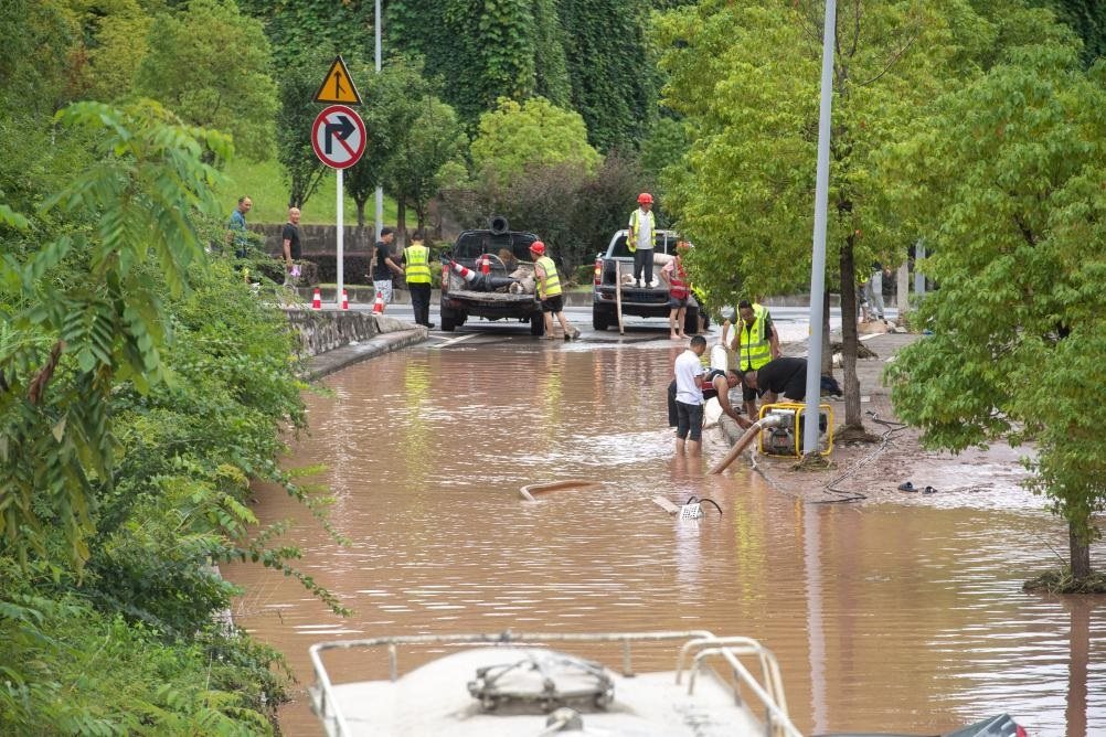 7月14日,在重慶市萬(wàn)州區(qū)江南新區(qū),救援人員進(jìn)行排水搶險(xiǎn)作業(yè)。新華社記者 唐奕 攝