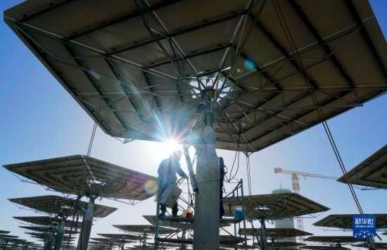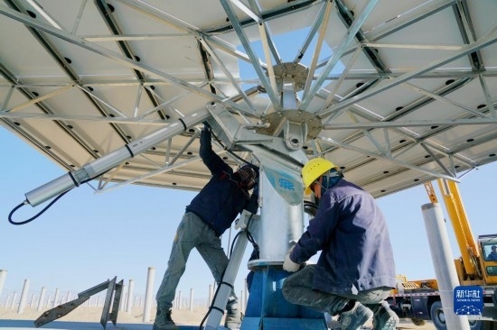 7月21日,在阿克塞千萬千瓦級(jí)可再生能源多能互補(bǔ)基地,工人在匯東新能源75萬千瓦光熱+項(xiàng)目建設(shè)現(xiàn)場施工。新華社發(fā)(馬曉偉 攝)