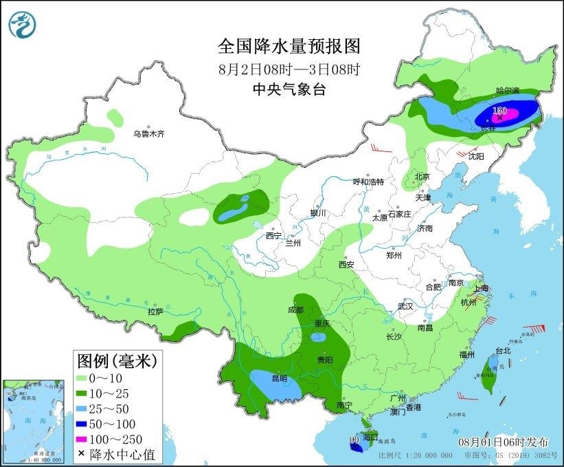 8月2日08時(shí)至3日08時(shí),內(nèi)蒙古東部、黑龍江南部、吉林大部、青海北部、四川東部、貴州、云南、廣西西部、海南島、臺(tái)灣島等地部分地區(qū)有中到大雨,其中,黑龍江東南部、吉林中東部、海南島西南部等地局地有暴雨或大暴雨(100~150毫米)。遼寧中部、浙江北部等地部分地區(qū)有4~5級(jí)風(fēng)(見(jiàn)圖2)。