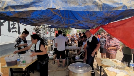 午飯時分,在西茨村村口一側的臨時飯點,志愿者從臨時搭建的鐵鍋中,盛出一碗碗熱湯燴面,捧給排隊村民。這是涿州市城區(qū)一家燴面館免費給村民提供的。