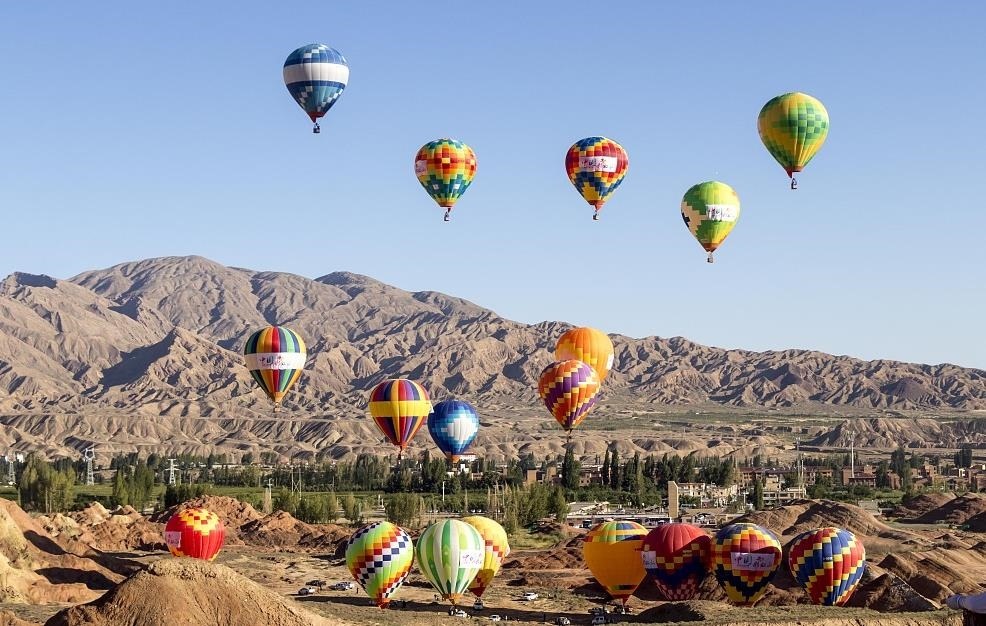 來自全國各地的熱氣球運(yùn)動員駕乘熱氣球,在甘肅張掖七彩丹霞上空進(jìn)行飛行表演,上演熱氣球與丹霞的美麗邂逅。