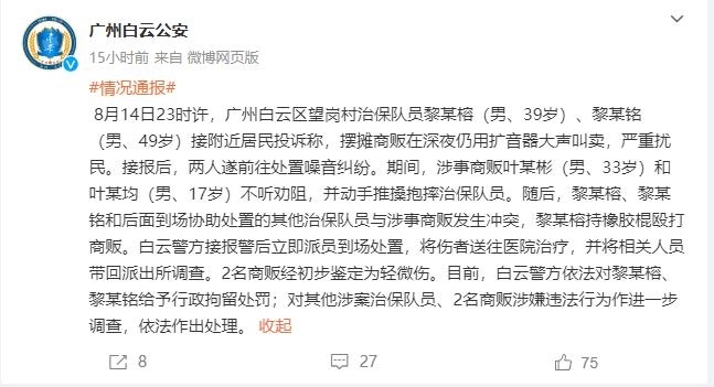 ·廣州警方通報(bào)治保隊(duì)員持棍打商販:處置噪音糾紛時(shí)發(fā)生沖突,2名治保隊(duì)員被行拘。