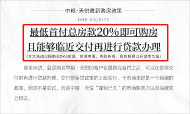 8月26日,紅星資本局向“中糧天悅”售樓部求證此時(shí),一名置業(yè)顧問回復(fù)稱,最近確實(shí)推出了“先交付后還貸”的購(gòu)房政策,購(gòu)房者可以先交首付,簽訂購(gòu)房合同,交房前再辦理貸款即可。