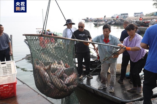 在滿載而歸的漁船上既有鯉魚、鰱魚、草魚、鱖魚、鯽魚,還有河蟹、小龍蝦、甲魚等湖鮮,其中漁民劉忠誠(chéng)捕捉到一條 41.6斤的鰱魚,獲得今年的鰱魚王稱號(hào)。