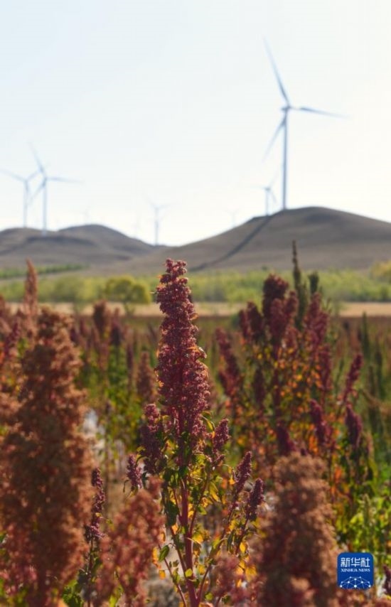 10月1日,在沽源縣白土窯鄉(xiāng)小西溝村,當(dāng)?shù)剞r(nóng)機手王永成在操作收割機收獲藜麥。