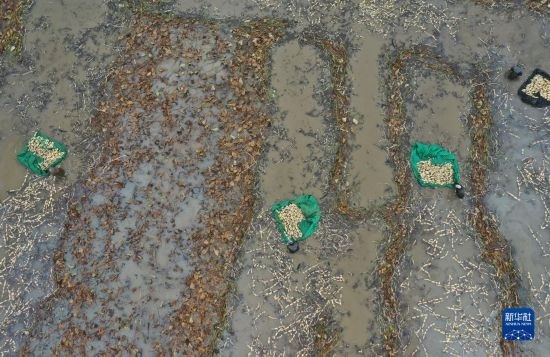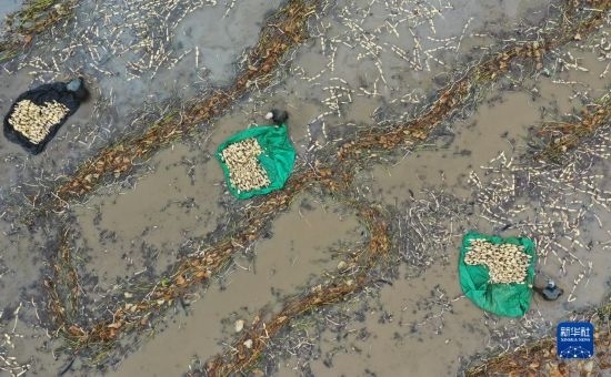 10月5日,河北省新河縣西流鄉(xiāng)西董村一家蓮藕種植合作社的社員在收獲蓮藕(無人機照片)。