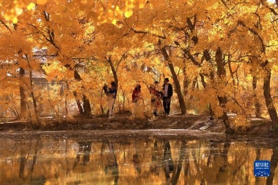 10月17日,游客在甘肅省敦煌市莫高鎮(zhèn)的胡楊林中賞景。