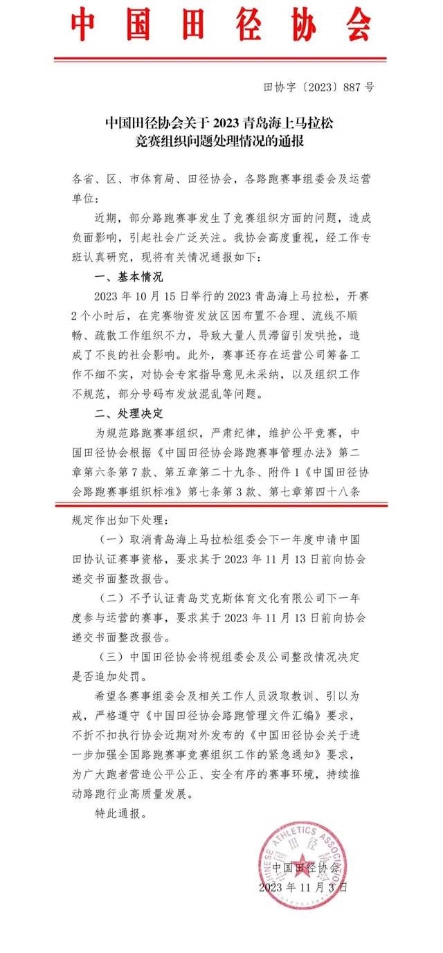央視網(wǎng)消息:據(jù)“中國馬拉松平臺”官微消息,近日,部分路跑賽事出現(xiàn)了一些競賽組織問題,引發(fā)社會廣泛關(guān)注,造成了不良的社會影響。中國田徑協(xié)會高度重視、全面調(diào)查,依據(jù)事實和路跑賽事管理規(guī)定,從加強競賽組織,壓實各方主體責(zé)任,提示行業(yè)風(fēng)險隱患的角度,對相關(guān)單位和人員進行了相應(yīng)處理?,F(xiàn)將處理情況通報如下: