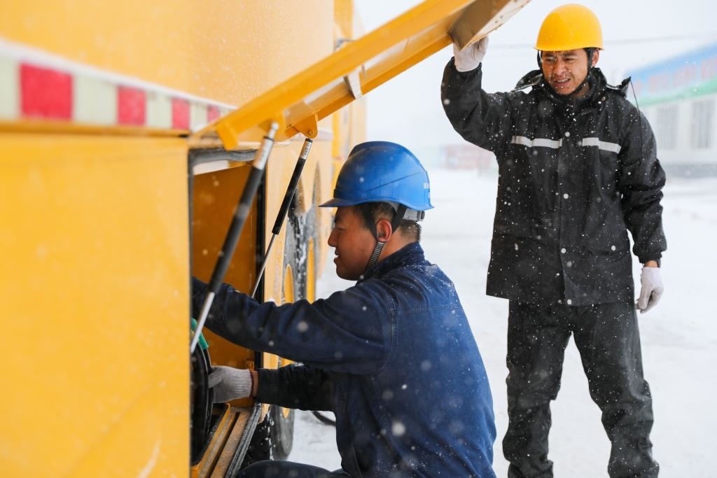 6日,國網(wǎng)長春供電公司工作人員在雪中保障供電。新華社記者顏麟蘊 攝