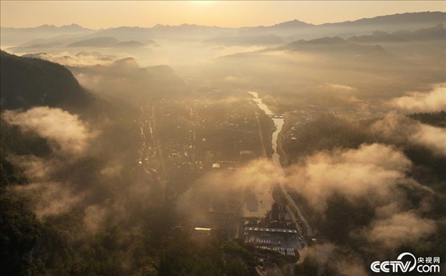 湖南張家界,武陵源景區(qū)內(nèi),朝霞、霧氣交錯疊彩,云紗霧幔的小城和群山環(huán)繞的美景交融。