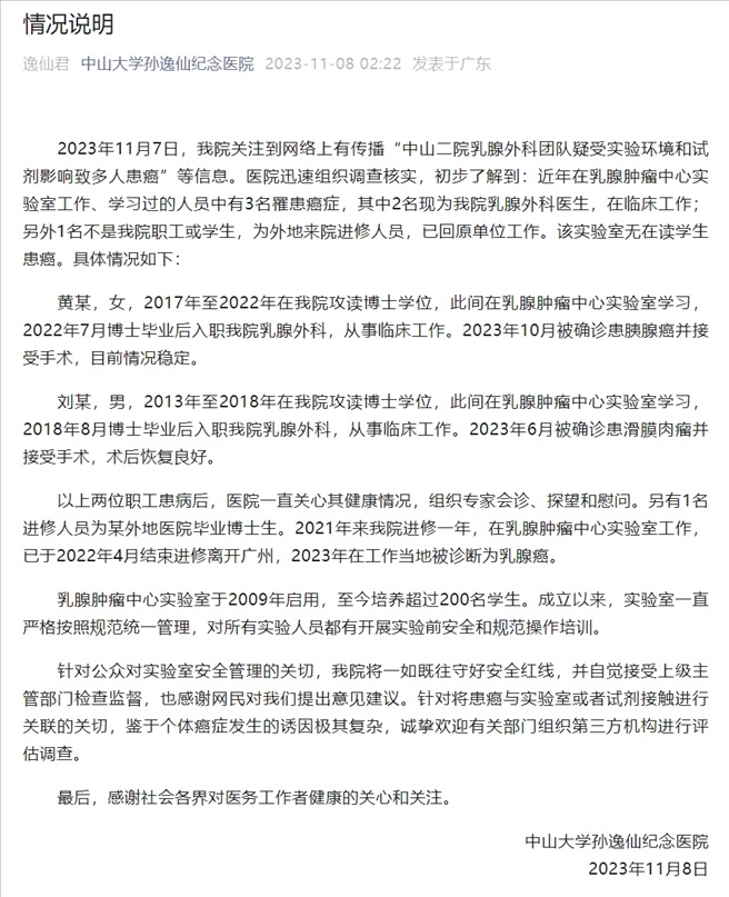 ·中山二院通報乳腺外科團隊多人患癌:近年有3人患癌,無在讀學(xué)生。