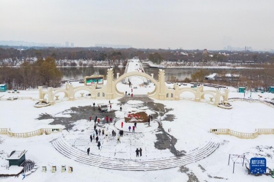 11月9日,人們在太陽島景區(qū)門前清掃積雪、游玩拍照(無人機照片)。