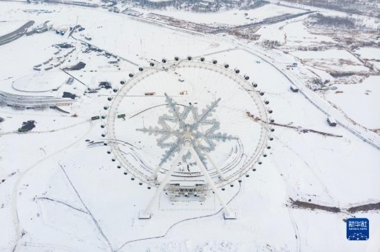 這是11月9日拍攝的位于哈爾濱冰雪大世界園區(qū)內(nèi)的雪花摩天輪(無人機照片)。