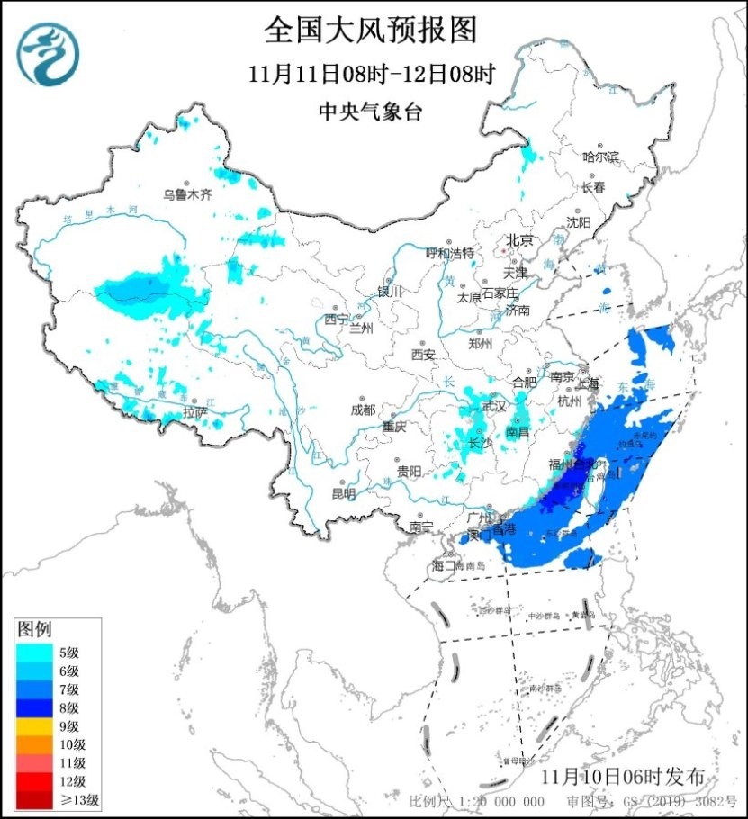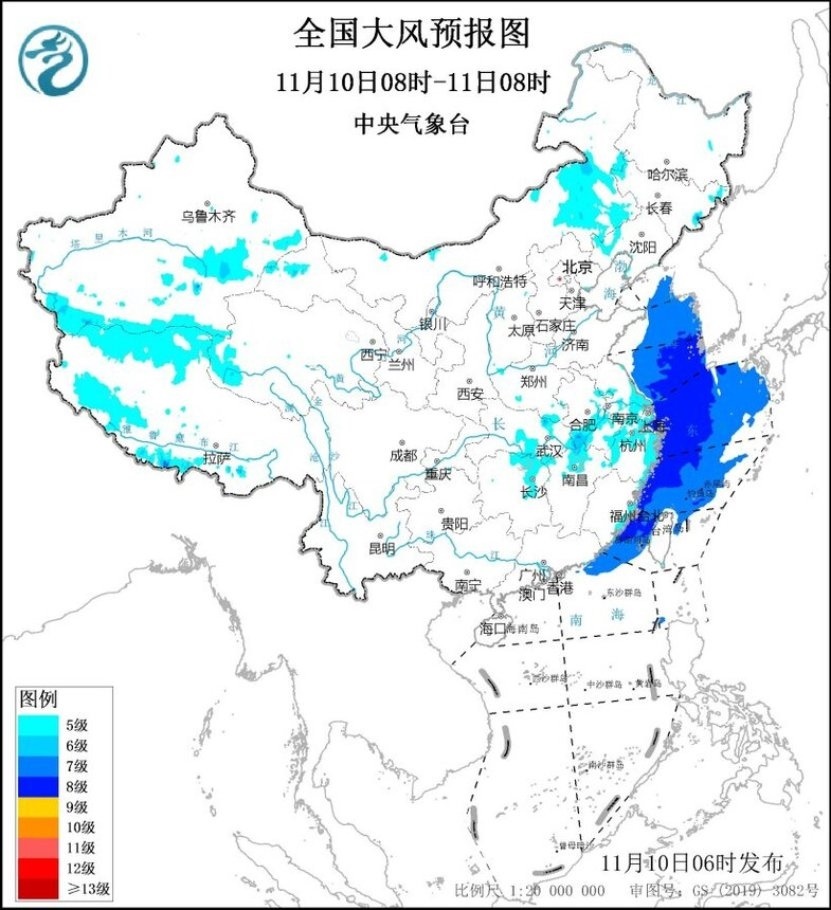 11月10日08時(shí)至11日08時(shí),內(nèi)蒙古中東部、遼寧西部、安徽中南部、河南南部、江蘇南部、上海、湖北南部、湖南東北部、江西北部、浙江北部及東部沿海、福建沿海、臺(tái)灣島沿海等地有5~6級(jí)、陣風(fēng)7~8級(jí)的大風(fēng);黃海大部海域、東海大部海域、臺(tái)灣海峽、臺(tái)灣以東洋面偏北海域、南海東北部偏北海域?qū)⒂?~8級(jí)、陣風(fēng)9~10級(jí)的大風(fēng)。11月11日08時(shí)至12日08時(shí),安徽南部、湖北中東部、湖南大部、江西中北部、廣西東北部以及福建沿海、廣東東部沿海、臺(tái)灣島沿海等地有5~6級(jí)、陣風(fēng)7~8級(jí)的大風(fēng);東海大部海域、臺(tái)灣海峽、臺(tái)灣以東洋面、南海北部海域、巴士海峽偏北海域?qū)⒂?~8級(jí)、陣風(fēng)9~10級(jí)的大風(fēng)。中央氣象臺(tái)11月10日06時(shí)繼續(xù)發(fā)布大風(fēng)藍(lán)色預(yù)警(見(jiàn)圖2、3)。