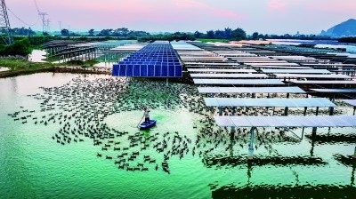 在廣西壯族自治區(qū)南寧市上林縣白圩鎮(zhèn)登山村,養(yǎng)殖戶在光伏板旁給鴨子喂食?!皾O光互補(bǔ)”拓寬了當(dāng)?shù)刂赂辉鍪盏那馈E擞罃z