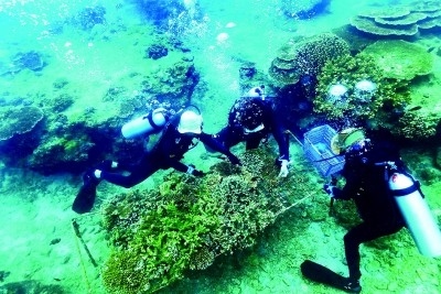 海底護(hù)林員在海南省陵水黎族自治縣分界洲島海域清理垃圾、移植珊瑚斷肢。張杰攝