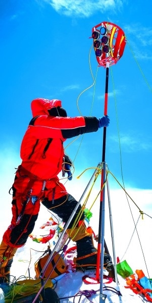 “2020珠峰高程測(cè)量登山隊(duì)”成功登頂世界第一高峰珠穆朗瑪峰,隊(duì)員在峰頂開(kāi)展測(cè)量工作。扎西次仁攝