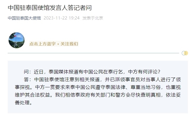 ·中國(guó)駐泰國(guó)大使館回應(yīng)網(wǎng)傳有中國(guó)公民在泰行乞:注意到相關(guān)報(bào)道,并已派領(lǐng)事官員對(duì)當(dāng)事人進(jìn)行了領(lǐng)事探視。