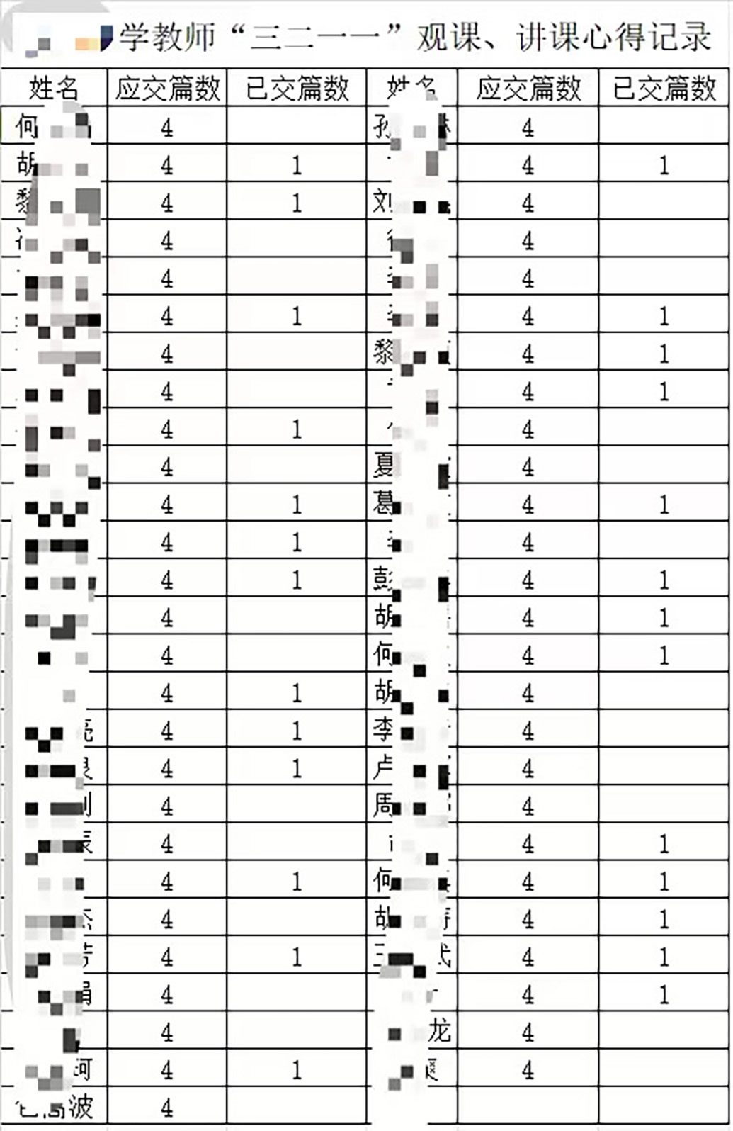 作為班主任,她承擔(dān)管理班級(jí)的責(zé)任,學(xué)校為了“看見(jiàn)”管理內(nèi)容,會(huì)安排教師們填寫(xiě)各種各樣的表格,包括每日缺勤記錄表,每日、每周、每月、每學(xué)期的安全記錄表,班主任工作手冊(cè),行為規(guī)范課堂記錄表,家訪表,家長(zhǎng)會(huì)座談表等。表格一多,何雪夕免不了“造假”。