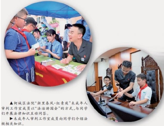 “‘紅青庭’品牌Logo中,‘紅’字既突出黨建統(tǒng)領(lǐng)又寓意紅領(lǐng)巾,是百折不撓的精神象征;‘青’字代表著青少年,是肩負(fù)未來的青春力量;‘庭’字則是指少年法庭和家庭。”胡衛(wèi)民介紹,柯城區(qū)法院依托“浙里春風(fēng)·紅青庭”品牌,成立青少年法治教育實踐基地和未成年人審判工作室,積極開展內(nèi)外聯(lián)動,在持續(xù)加強涉未成年人刑事、民事、行政審判融合的基礎(chǔ)上,不斷深化與公安、檢察、教育、團委、婦聯(lián)等部門的協(xié)調(diào)配合,構(gòu)筑全方位、多鏈條的綜合司法保護機制。