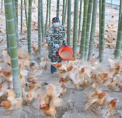 安吉縣利用良好生態(tài)優(yōu)勢發(fā)展林下養(yǎng)殖。圖為農戶正給竹林雞喂食。夏鵬飛攝