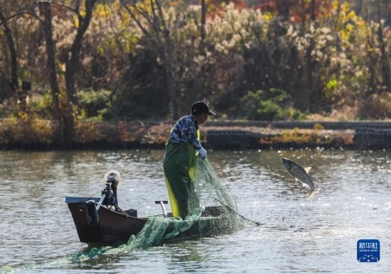 12月14日,在諸暨市白塔湖國(guó)營(yíng)漁場(chǎng)的水域內(nèi),漁民們?cè)谑站W(wǎng)捕魚。